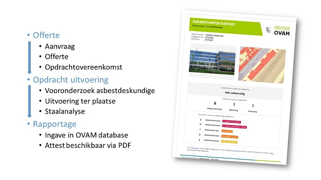 De asbestdeskundige stopt alle bekomen data ( foto's toepassingen,asbestanalyses,zone van toepassing,...) in de OVAM database van hieruit wordt een attest gegenereerd die dan ter beschikking komt voor de klant.Tevens komt het asbestattest ook in de nieuwe Woningpas. Het attest heeft een geldigheidsduur van 10 jaar behalve wanneer een asbesttoepassing wordt ontdekt met een hoog materiaalrisico.